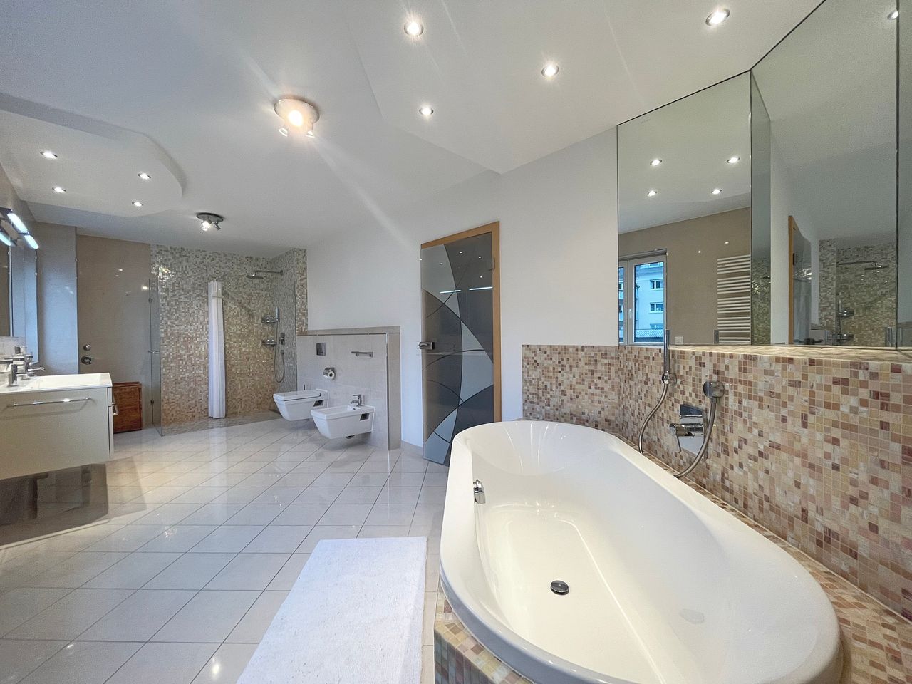 Rechts des Flures befindet sich das Tageslichtbadezimmer, das durch seine Großzügigkeit besticht und zudem nicht nur über eine bodentiefe Dusche, sondern auch über eine elegante Eckbadewanne verfügt.