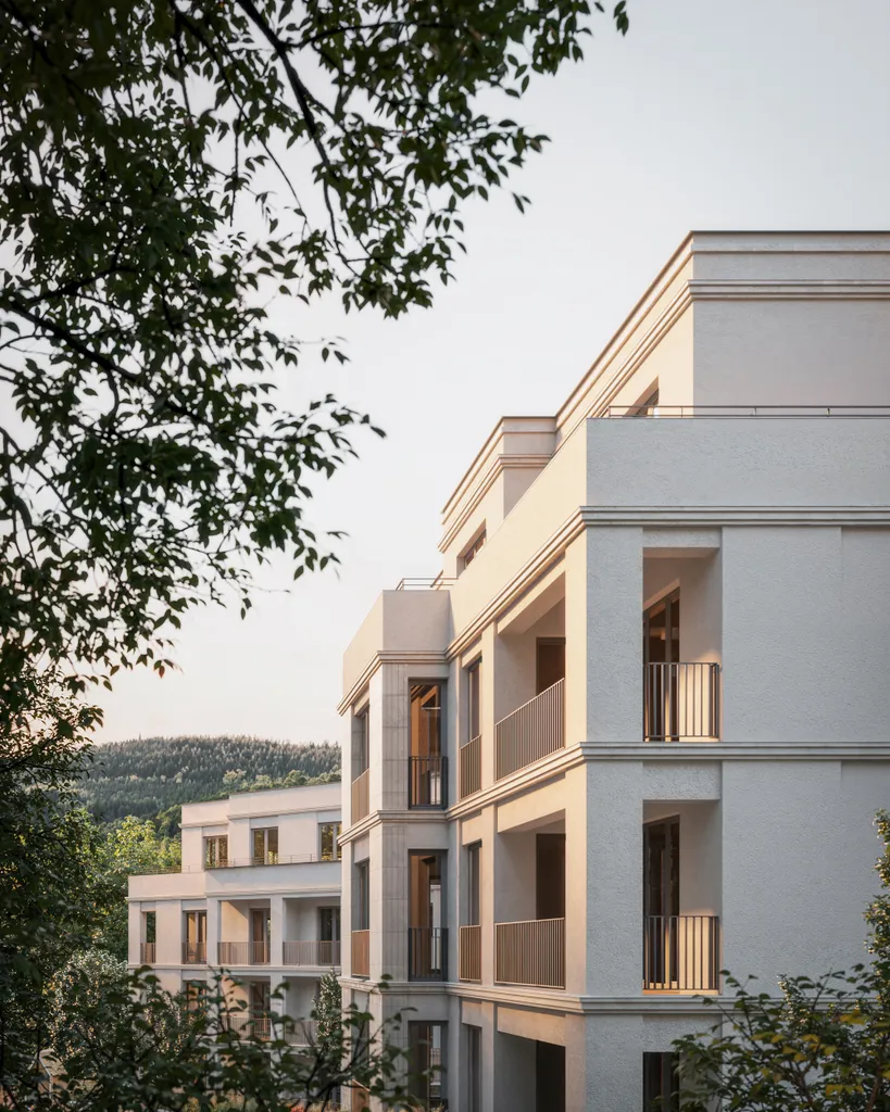 „Wohnen am Rosengarten“ ist ein Neubauprojekt in ansprechender, konzentrierter Form. Kein Großensemble, kein Solitär – sondern eine mit Augenmaß geplante, großzügige Anlage, eingebettet in ein gewachsenes, behagliches Umfeld. Die Gebäude sind fein gegliedert und klar proportioniert. Ihre Staffelung, die zurückhaltende Fassadengestaltung und der bewusst gesetzte Abstand zueinander verleihen dem Ensemble eine lichte Ruhe, die man eher von gewachsenen Villenlagen kennt als von Neubauten. Zwischen den Häusern entstehen offene Zonen, Blickachsen und Grünräume, die dem Ort Weite geben.